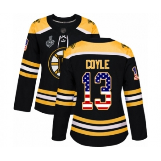 >Women's Boston Bruins #13 Charlie Coyle Authentic Black USA Flag Fashion 2019 Stanley Cup Final Bound Hockey Jersey