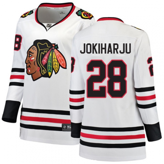 Home>NHL>Chicago Blackhawks>Henri Jokiharju>Women's Chicago Blackhawks #28 Henri Jokiharju Authentic White Away Fanatics Branded Breakaway NHL Jersey
