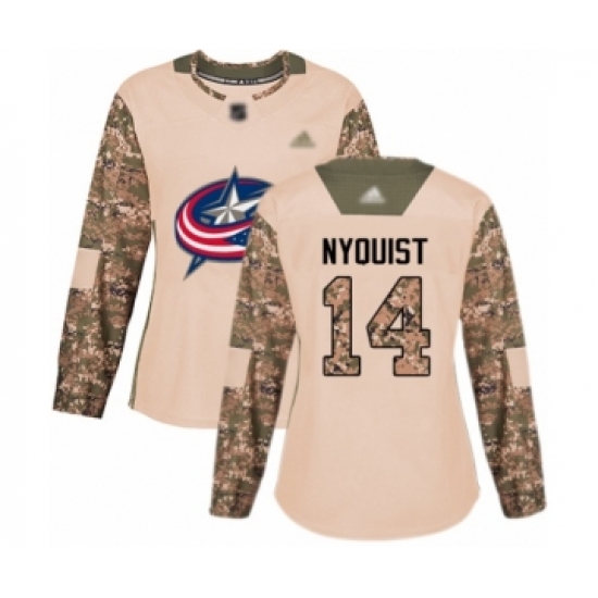 >Women's Columbus Blue Jackets #14 Gustav Nyquist Authentic Camo Veterans Day Practice Hockey Jersey