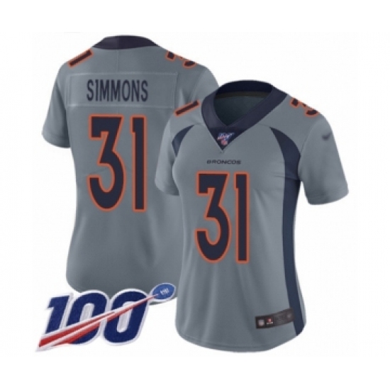 >Women's Denver Broncos #31 Justin Simmons Limited Silver Inverted Legend 100th Season Football Jersey