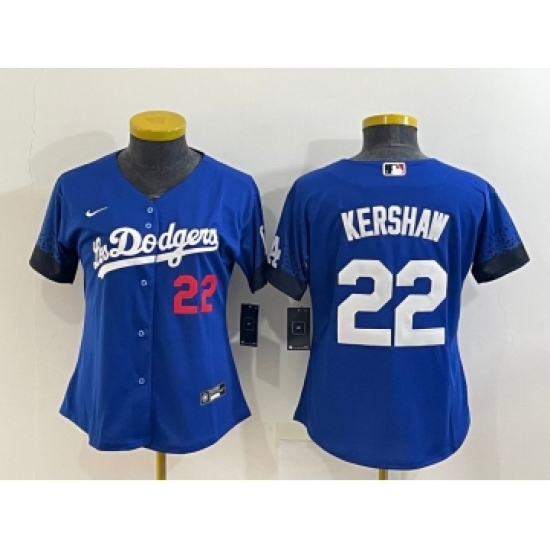 >Women's Los Angeles Dodgers #22 Clayton Kershaw Blue 2021 City Connect Number Cool Base Stitched Jersey