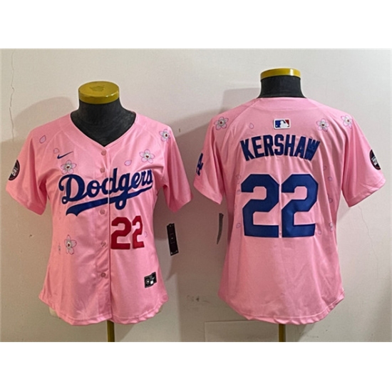>Women's Los Angeles Dodgers #22 Clayton Kershaw Pink 2025 Tokyo Series Limited Stitched Baseball Jersey(Run Small)