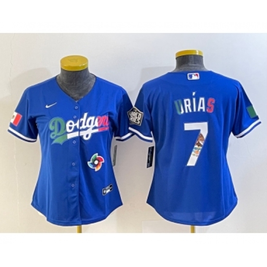 >Women's Los Angeles Dodgers #7 Julio Urias Blue 2020 World Series Cool Base Nike Jersey1