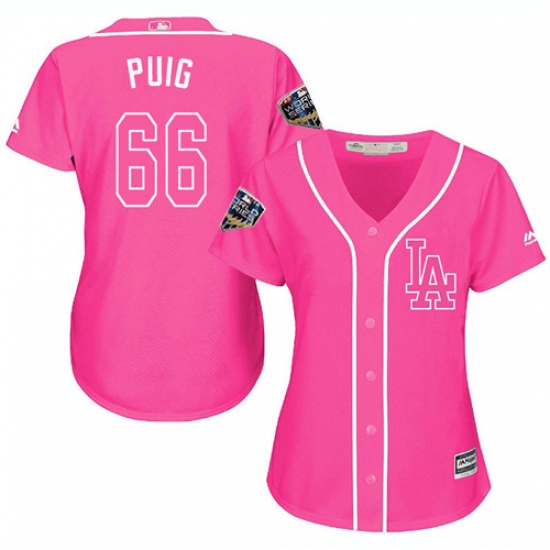 Women's Majestic Los Angeles Dodgers #66 Yasiel Puig Authentic Pink Fashion Cool Base 2018 World Series MLB Jersey