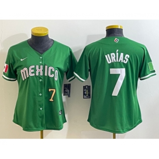 >Women's Mexico Baseball #7 Julio Urias Number 2023 Green World Classic Stitched Jersey