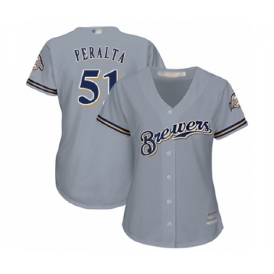 >Women's Milwaukee Brewers #51 Freddy Peralta Authentic Grey Road Cool Base Baseball Player Jersey