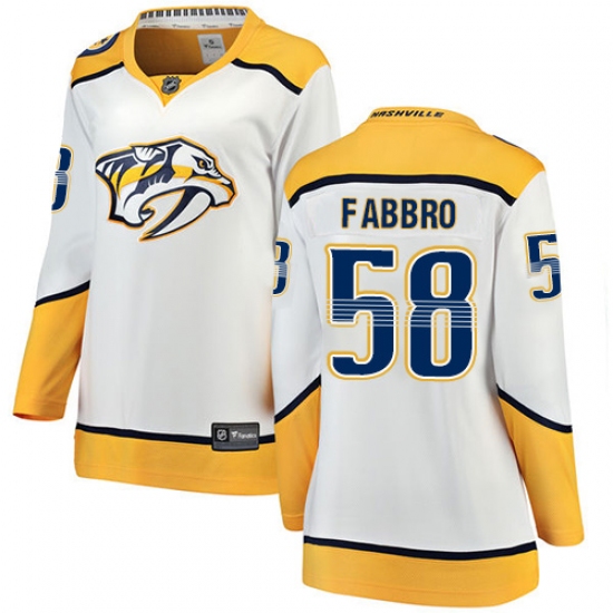 Home>NHL>Nashville Predators>Dante Fabbro>Women's Nashville Predators #58 Dante Fabbro Fanatics Branded White Away Breakaway NHL Jersey