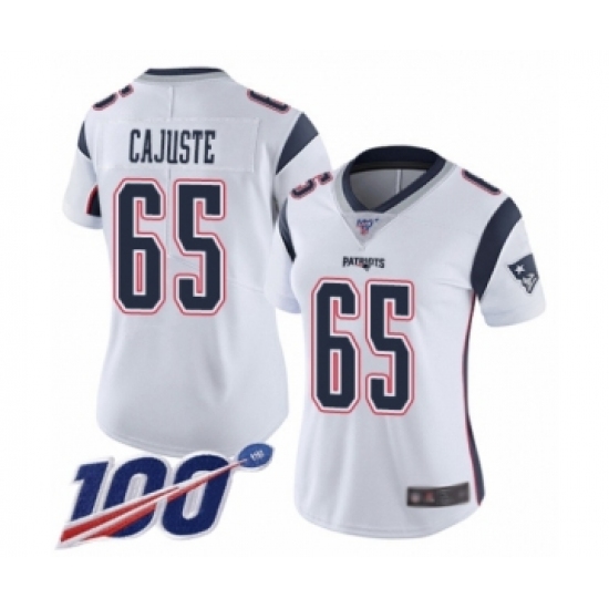 >Women's New England Patriots #65 Yodny Cajuste White Vapor Untouchable Limited Player 100th Season Football Jersey