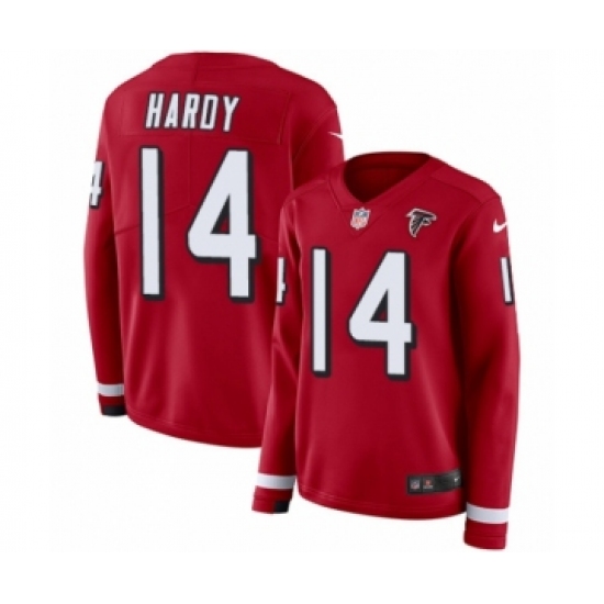 >Women's Nike Atlanta Falcons #14 Justin Hardy Limited Red Therma Long Sleeve NFL Jersey