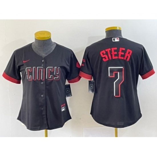 >Women's Nike Cincinnati Reds #7 Spencer Steer Black 2023 City Connect Cool Base Stitched Baseball Jersey