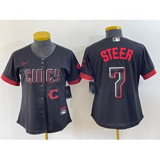 >Women's Nike Cincinnati Reds #7 Spencer Steer Black 2023 City Connect Cool Base Stitched Baseball Jersey1