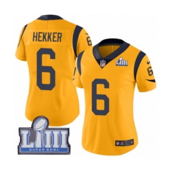 >Women's Nike Los Angeles Rams #6 Johnny Hekker Limited Gold Rush Vapor Untouchable Super Bowl LIII Bound NFL Jersey