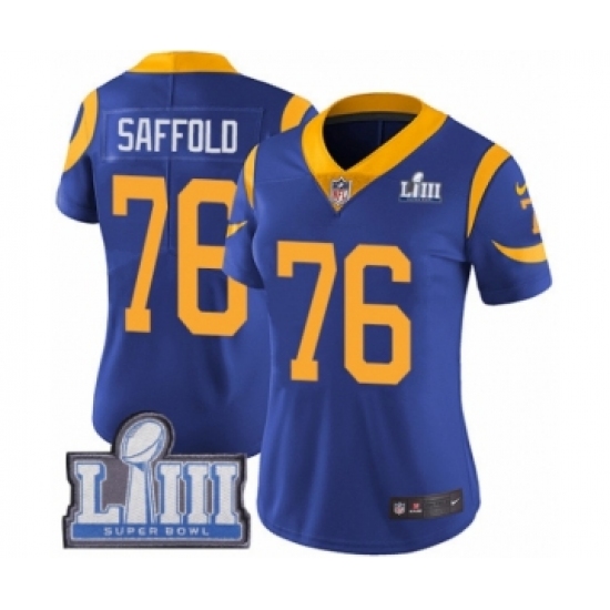 >Women's Nike Los Angeles Rams #76 Rodger Saffold Royal Blue Alternate Vapor Untouchable Limited Player Super Bowl LIII Bound NFL Jersey