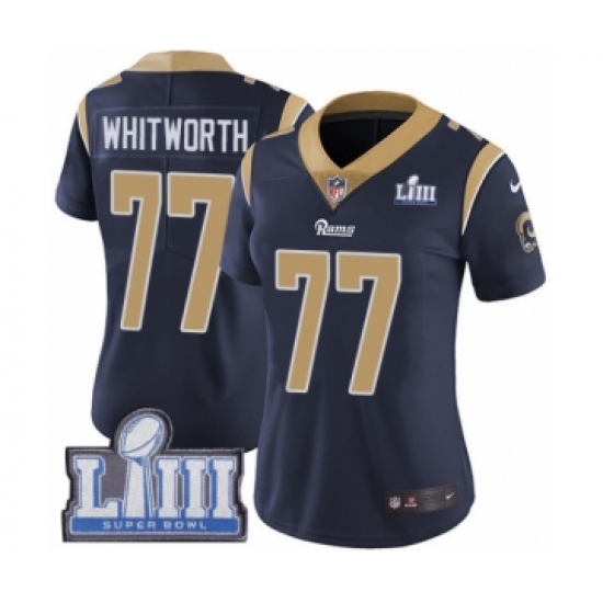 >Women's Nike Los Angeles Rams #77 Andrew Whitworth Navy Blue Team Color Vapor Untouchable Limited Player Super Bowl LIII