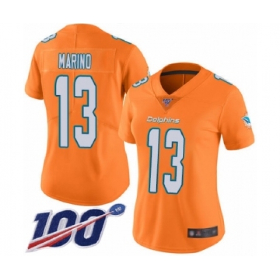 >Women's Nike Miami Dolphins #13 Dan Marino Limited Orange Rush Vapor Untouchable 100th Season NFL Jersey