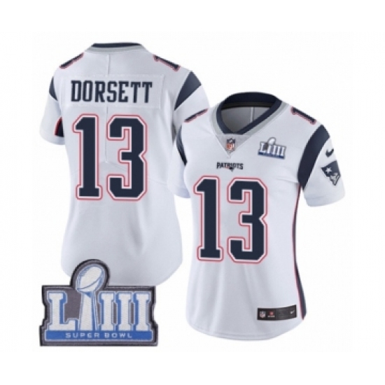 >Women's Nike New England Patriots #13 Phillip Dorsett White Vapor Untouchable Limited Player Super Bowl LIII Bound NFL Jersey