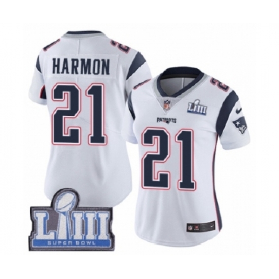 Women's Nike New England Patriots #21 Duron Harmon White Vapor Untouchable Limited Player Super Bowl LIII Bound NFL Jersey