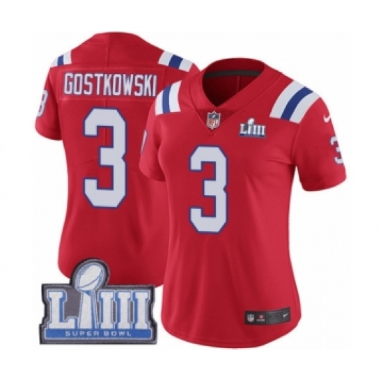 >Women's Nike New England Patriots #3 Stephen Gostkowski Red Alternate Vapor Untouchable Limited Player Super Bowl LIII Bound NFL Jersey