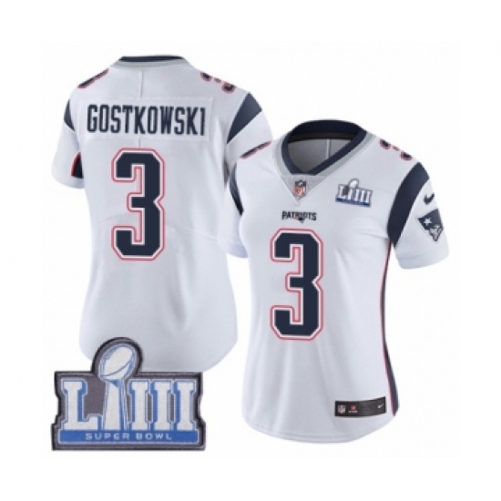 Women's Nike New England Patriots #3 Stephen Gostkowski White Vapor Untouchable Limited Player Super Bowl LIII Bound NFL Jersey