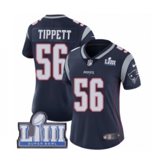 >Women's Nike New England Patriots #56 Andre Tippett Navy Blue Team Color Vapor Untouchable Limited Player Super Bowl LIII Bound NFL Jersey
