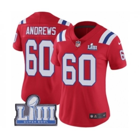 Women's Nike New England Patriots #60 David Andrews Red Alternate Vapor Untouchable Limited Player Super Bowl LIII Bound NFL Jersey