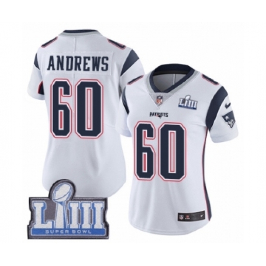 >Women's Nike New England Patriots #60 David Andrews White Vapor Untouchable Limited Player Super Bowl LIII Bound NFL Jersey
