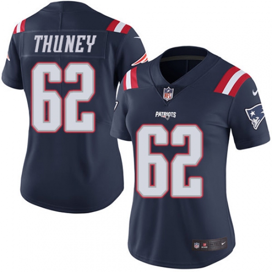 Home>NFL>New England Patriots>Joe Thuney>Women's Nike New England Patriots #62 Joe Thuney Limited Navy Blue Rush Vapor Untouchable NFL Jersey