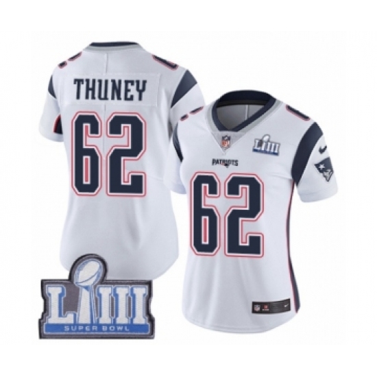 Women's Nike New England Patriots #62 Joe Thuney White Vapor Untouchable Limited Player Super Bowl LIII Bound NFL Jersey