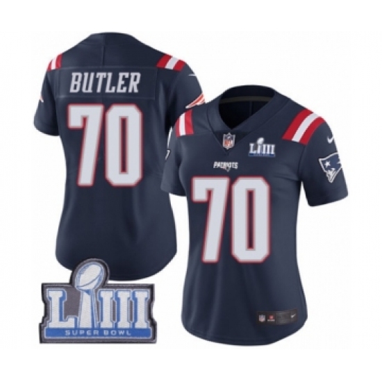 >Women's Nike New England Patriots #70 Adam Butler Limited Navy Blue Rush Vapor Untouchable Super Bowl LIII Bound NFL Jersey