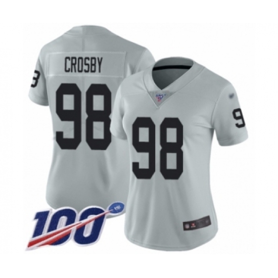 >Women's Oakland Raiders #98 Maxx Crosby Limited Silver Inverted Legend 100th Season Football Jersey