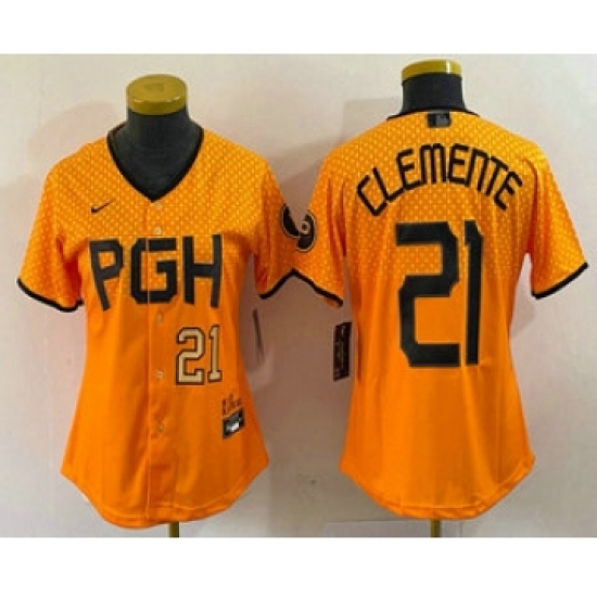 >Women's Pittsburgh Pirates #21 Roberto Clemente Number Yellow 2023 City Connect Stitched Jersey2