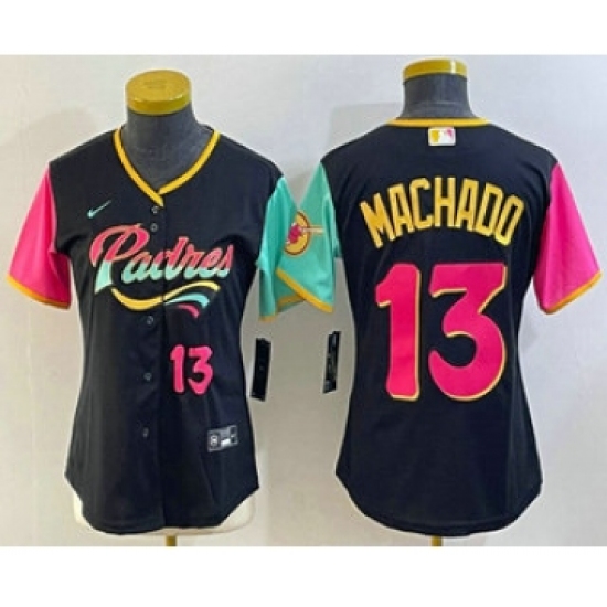 >Women's San Diego Padres #13 Manny Machado Black Number 2022 City Connect Cool Base Stitched Jersey