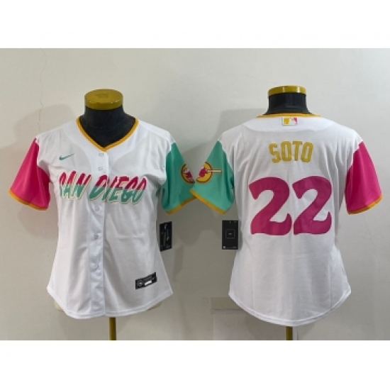 >Women's San Diego Padres #22 Juan Soto White 2022 City Connect Cool Base Stitched Jersey