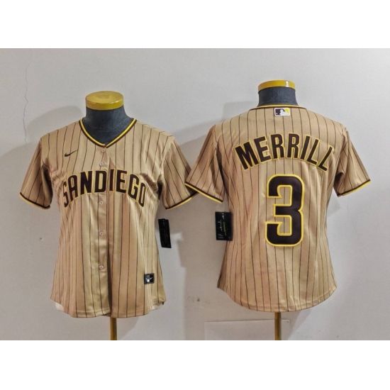 >Women's San Diego Padres #3 Jackson Merrill Tan Stitched Baseball Jersey(Run Small)