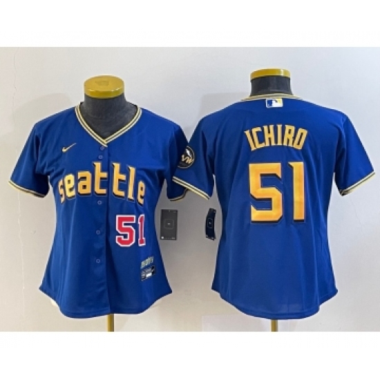 >Women's Seattle Mariners #51 Ichiro Suzuki Number Blue 2023 City Connect Cool Base Stitched Jersey1