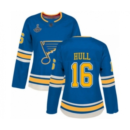 Women's St. Louis Blues #16 Brett Hull Authentic Navy Blue Alternate 2019 Stanley Cup Champions Hockey Jersey