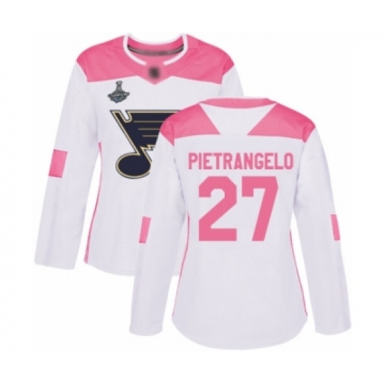 Women's St. Louis Blues #27 Alex Pietrangelo Authentic White Pink Fashion 2019 Stanley Cup Champions Hockey Jersey