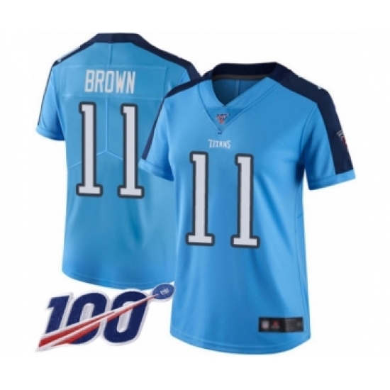 >Women's Tennessee Titans #11 A.J. Brown Limited Light Blue Rush Vapor Untouchable 100th Season Football Jersey