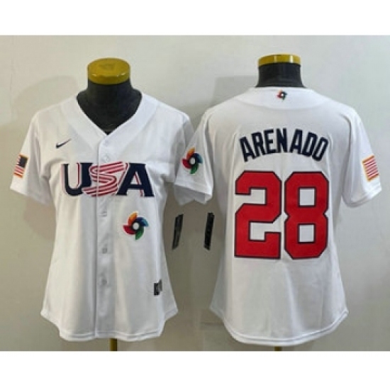 Women's USA Baseball #28 Nolan Arenado 2023 White World Classic Replica Stitched Jersey