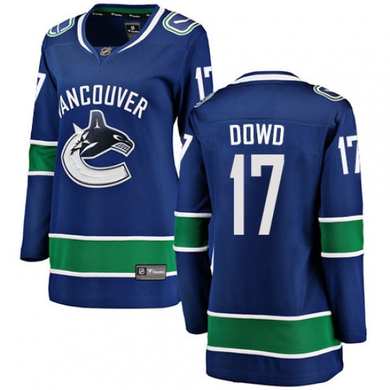 >Women's Vancouver Canucks #17 Nic Dowd Fanatics Branded Blue Home Breakaway NHL Jersey