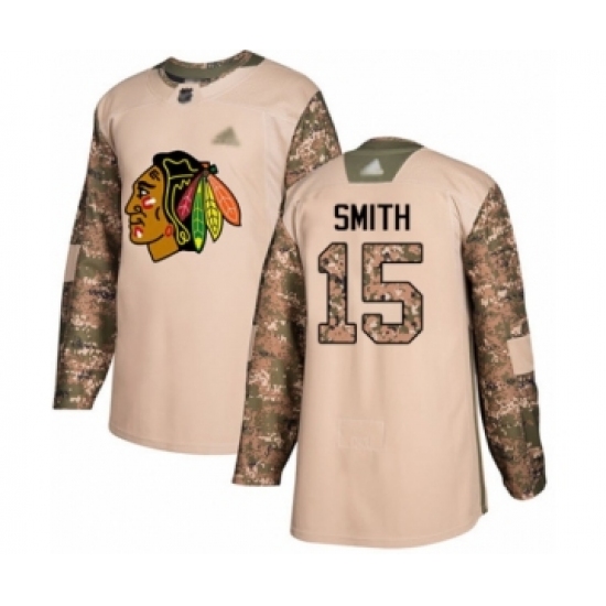 >Youth Chicago Blackhawks #15 Zack Smith Authentic Camo Veterans Day Practice Hockey Jersey
