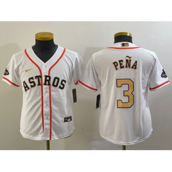 >Youth Houston Astros #3 Jeremy Pena 2023 White Gold World Serise Champions Cool Base Stitched Jersey