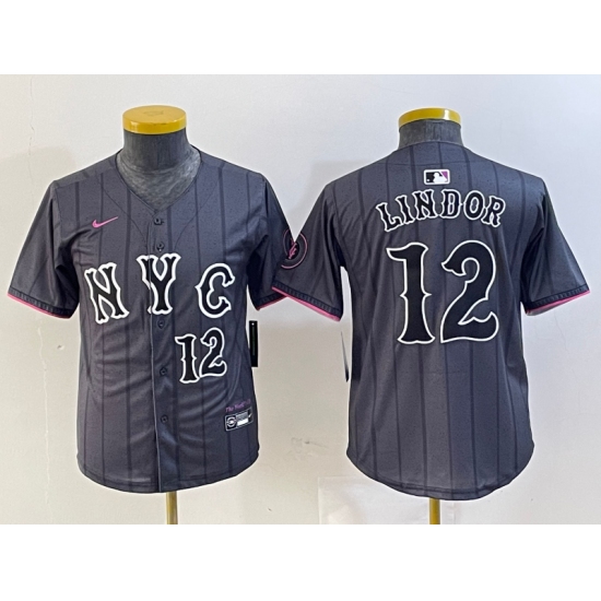 >Youth New York Mets #12 Francisco Lindor Number Grey 2024 City Connect Cool Base Stitched Jersey