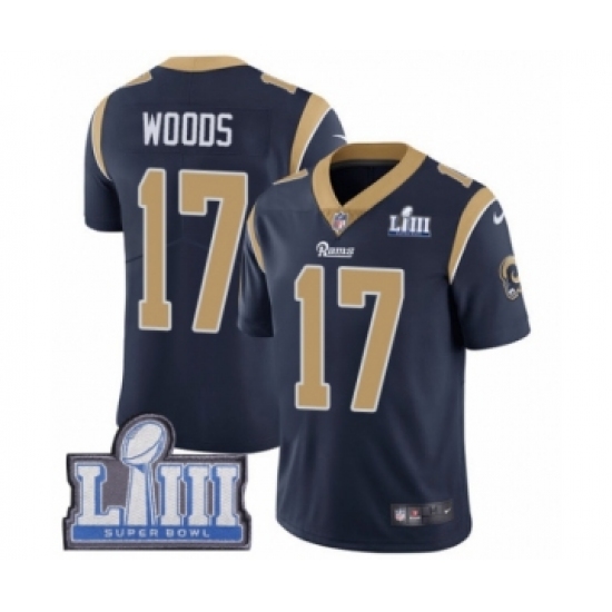 >Youth Nike Los Angeles Rams #17 Robert Woods Navy Blue Team Color Vapor Untouchable Limited Player Super Bowl LIII Bound NFL Jersey