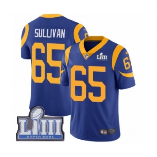 >Youth Nike Los Angeles Rams #65 John Sullivan Royal Blue Alternate Vapor Untouchable Limited Player Super Bowl LIII Bound NFL Jersey