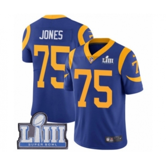 >Youth Nike Los Angeles Rams #75 Deacon Jones Royal Blue Alternate Vapor Untouchable Limited Player Super Bowl LIII Bound NFL Jersey