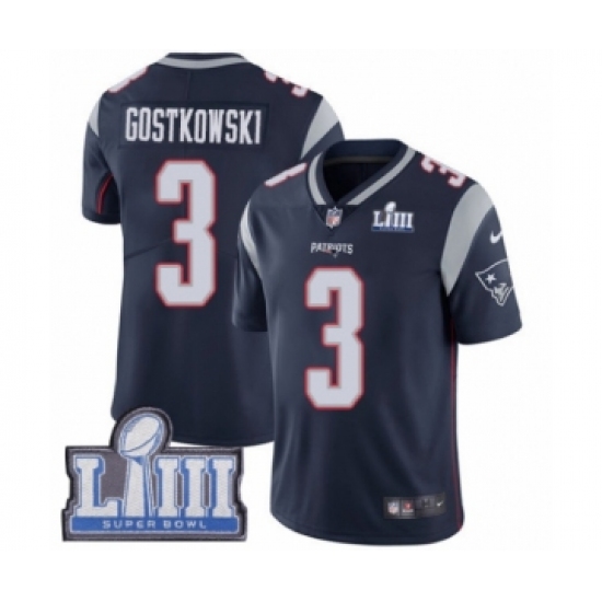Men's Nike New England Patriots #3 Stephen Gostkowski Navy Blue Team Color Vapor Untouchable Limited Player Super Bowl LIII Bound NFL Jersey