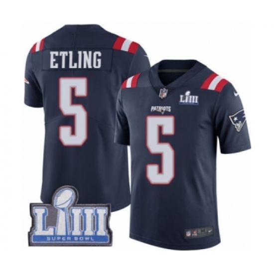 >Youth Nike New England Patriots #5 Danny Etling Limited Navy Blue Rush Vapor Untouchable Super Bowl LIII Bound NFL Jersey