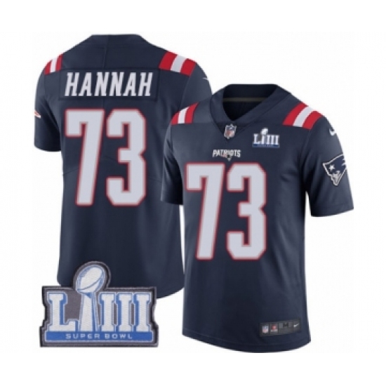 >Youth Nike New England Patriots #73 John Hannah Limited Navy Blue Rush Vapor Untouchable Super Bowl LIII Bound NFL Jersey