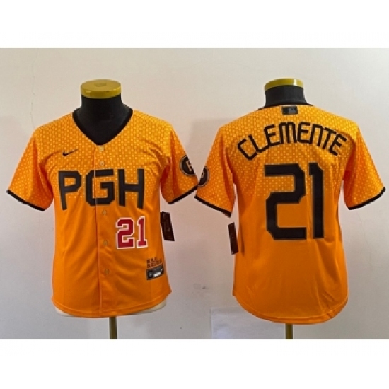 Youth Nike Pittsburgh Pirates #21 Roberto Clemente Number Yellow 2023 City Connect Stitched Jersey